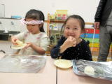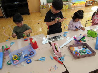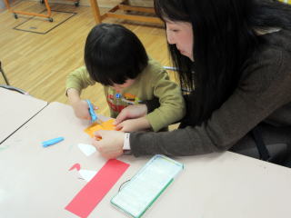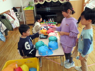 今日は今年初めての保育参加(「参観」ではありません)です。家族も一緒に幼稚園で保育を楽しもうという趣旨です。桃t組さんの「おすし屋さんごっこ」では候補のネタを色画用紙で作り絵をかいたり、玉子のネタでは海苔の巻き方を色々工夫して親子で作りました。最後は、100均の粒わたをシャリに見立て、お好みの握りを家族で食しました。