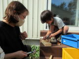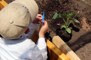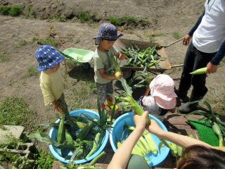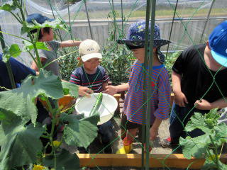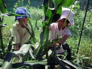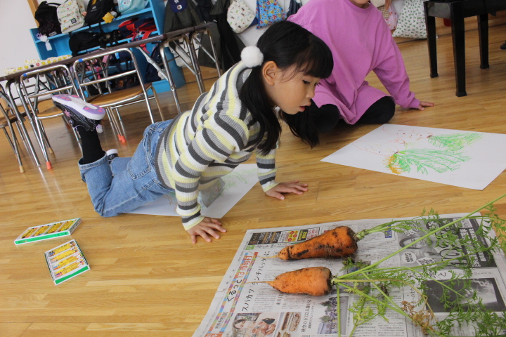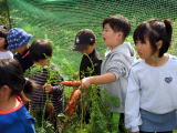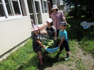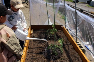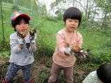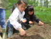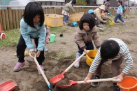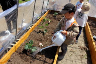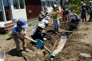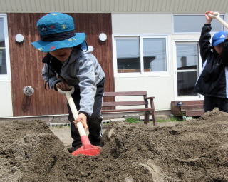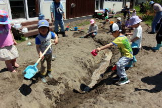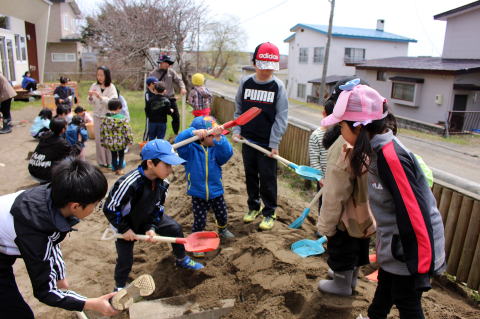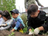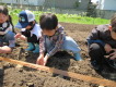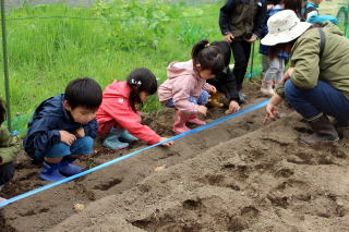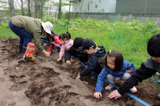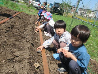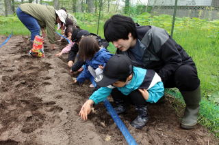 今年も恒例のジャガイモの種芋植えを行いました。種イモを二つに切って、木灰を切り口につけ腐るのを防ぎます。溝に植えた種イモの側に肥料を入れ軽く土をかけて作業終了です。秋に人参と一緒に収穫してjカレーライス大会の具材やイモ版画に使用する予定です。