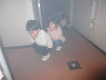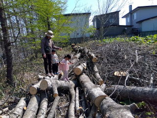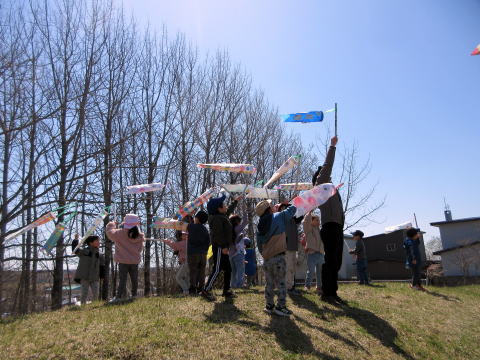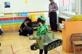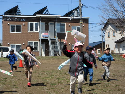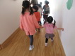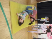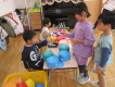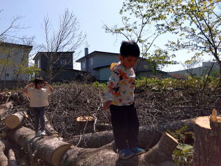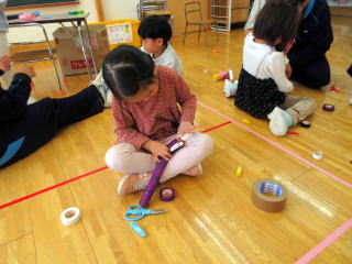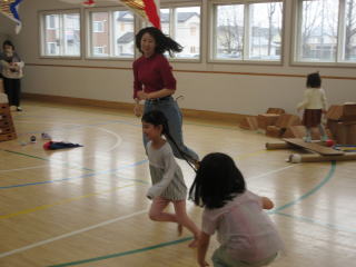 はじめの一週間は11時降園です。年小児は学園生活に慣れる期間、年長・年中児にはスクールバスの新メンバーとの新しい関係や年小者へのお世話も加わり練習する期間です。一方、遊戯室は色々な道具を駆使して、大人が想像する以上の発明遊具の体験会場に様変わりしています。