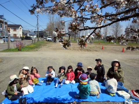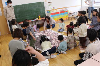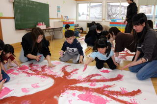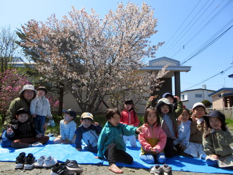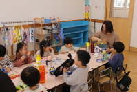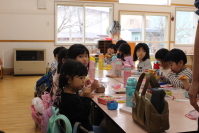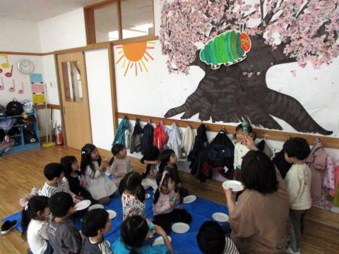 緑組では、春を見つけに園庭や築山に出かけた時のフキノトウやツクシを見つけたことを思い出し、春の花と言えば・・・さくら。「桜の木を描こう」をテーマに大きな模造紙に描いた桜の木に、蕾や五分咲きの桜を指や手で次々と描き満開になった桜の木を完成させました。両組とも子どもよりお母さんやお父さんの方が、だんだん夢中になって子どもと一緒にお寿司を作ったりお模造紙に桜の花を咲かせていましたね。