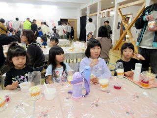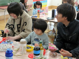 お弁当の時間まで一緒にいられたご家族の方は、自分の子や周りに他の子も一緒にご飯を食べられるのも楽しいものですね。(『園長の部屋』にお弁当のことを書いていますのでご覧ください) |