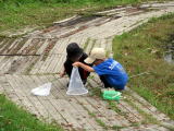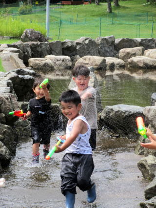 | 今日は水あそび日和。「風の子ひろば」の子どもたちも来たよ! |