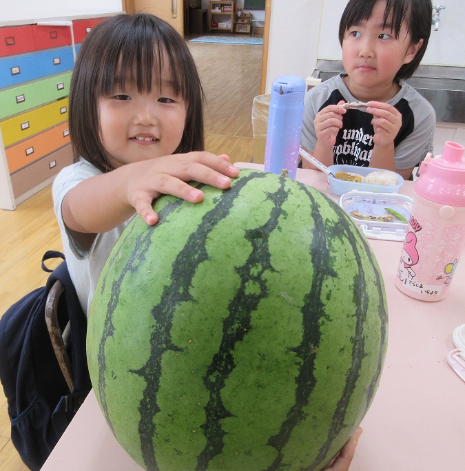 15日(月)からお弁当持参の通常保育で13時降園です。貝塚幼稚園では準備ができた人から「いただきます」を言って、周りが「めしあがれ」」と応え食べ始めています。みんなで食べる初めてのお弁当は、大きいのや色とりどりのおかずでとても華やかです。